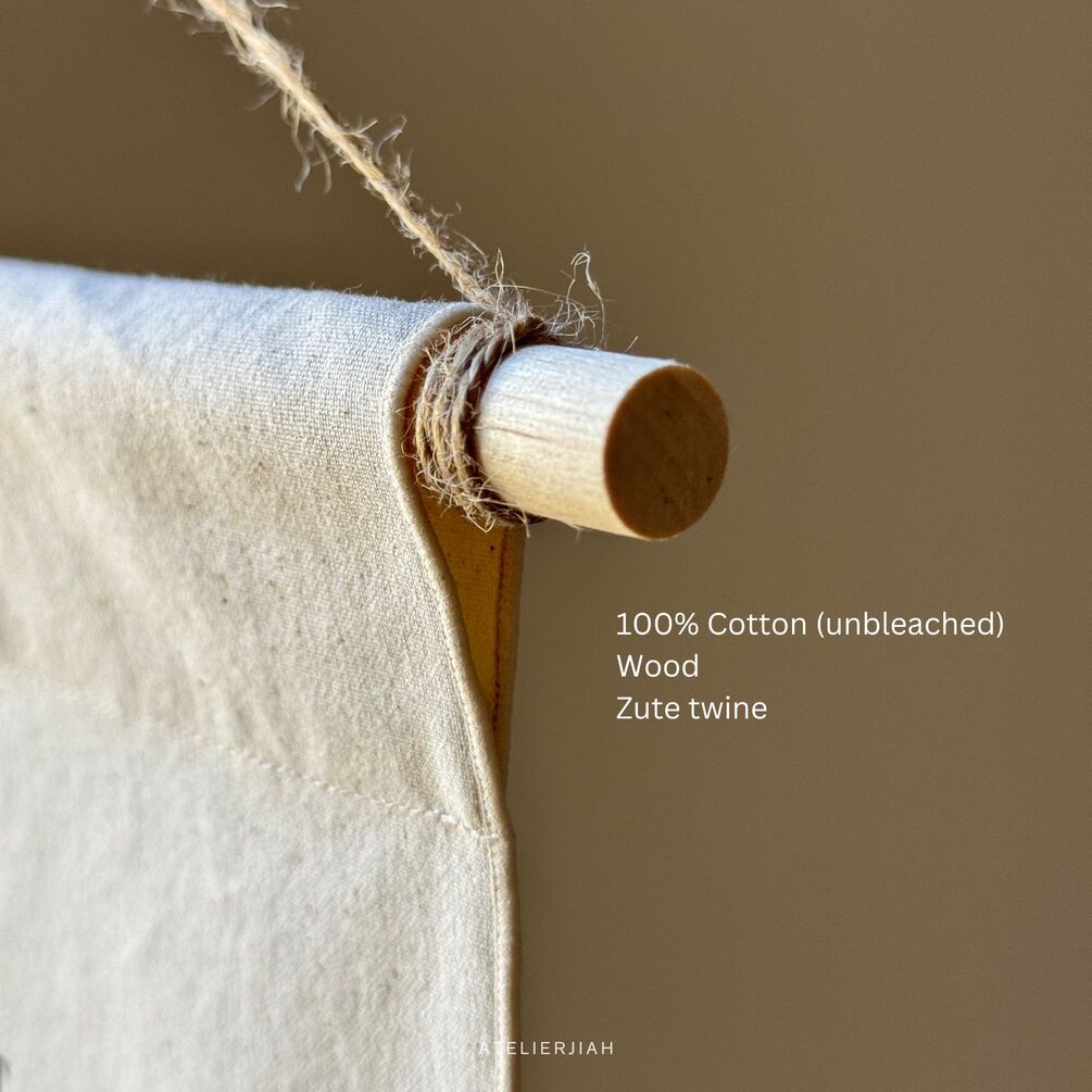 • Materials: 100% Unbleached Cotton*, Natural Wood, Natural Zute Twine